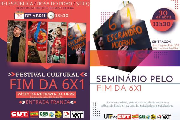 Ainda na quinta-feira (30 de abril), a CUT Paraná e demais entidades sindicais realizarão em Curitiba um seminário, às 13h30, no Sintracon (Rua Trajano Reis, 538), com o tema "6x1: Escravidão Moderna". Ainda no mesmo dia, a partir das 18h30, realizarão um festival de shows no Pátio da Reitoria da Universidade Federal do Paraná (UFPR).