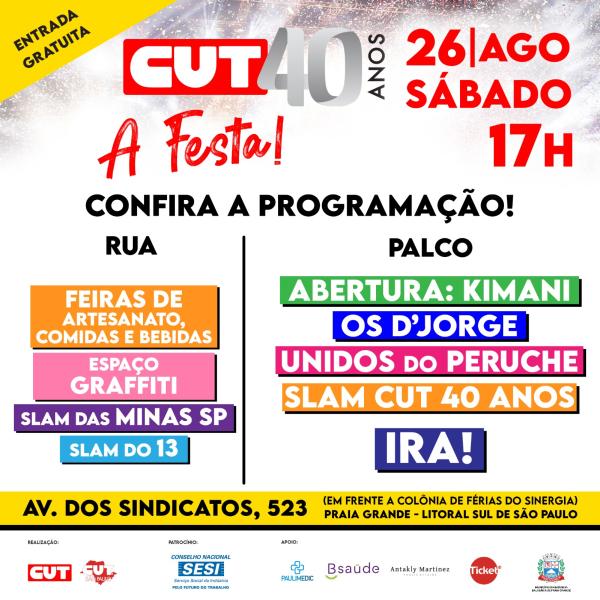 A CUT celebra 40 anos de lutas e conquistas, neste sábado (26), na cidade de Praia Grande, litoral sul de São Paulo, com shows musicais gratuitos, batalhas de Slam, feiras gastronômica e de artesanato, além de outras atividades artísticas e culturais. A banda Ira fecha o evento. Veja abaixo detalhes da programação.