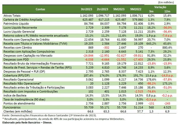 O banco Santander obteve lucro líquido recorrente de R$ 7,2 bilhões nos nove primeiros meses de 2023, queda de 36% em relação ao mesmo período de 2022, e crescimento de 18,2% no trimestre, tendo em vista que o lucro líquido recorrente no 3º trimestre foi de R$ 2,7 bilhões, frente aos R$ 2,3 bilhões do trimestre imediatamente anterior. A apuração pelo lucro líquido recorrente exclui efeitos extraordinários.
