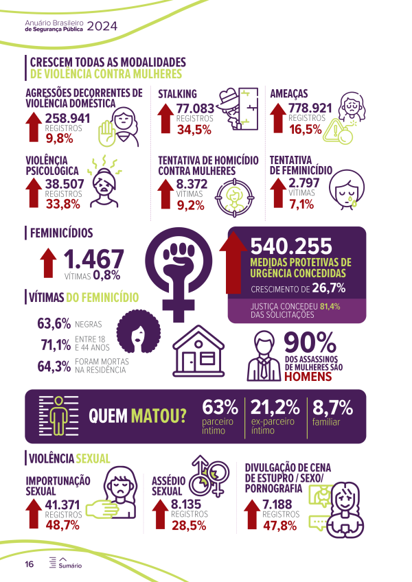 Aqui no Brasil, dados divulgados em 2024 pelo Fórum Brasileiro de Segurança Pública (FBSP), com base em informações oficiais, revelam que todas as modalidades de violência contra mulheres cresceram no país, entre 2022 e 2023. Entre as vítimas do feminicídio, 63,6% são mulheres e meninas negras, 71,1% entre 18 e 44 anos e 64,3% foram mortas dentro da própria residência. Além disso, 90% dos assassinos de mulheres são homens (63% parceiros íntimos, 21,2% ex-parceiros íntimos e 8,7% familiares).