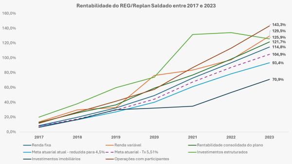 Para a Fenae, o atual perfil de investimentos do REG/Replan Saldado e Não Saldado reforça a viabilidade da adequação da meta atuarial para um patamar ainda mais elevado do que o que foi definido. Hoje, 77,49% dos recursos do Saldado e 80,52% do Não Saldado estão alocados em renda fixa, com rentabilidades médias de 5,85% acima do INPC, com uma duração da carteira de 8,98 anos.
