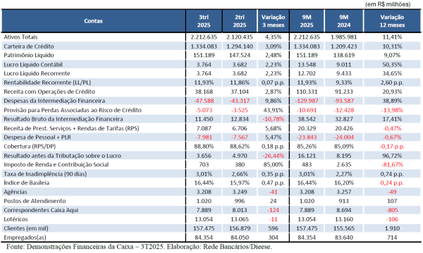 A Caixa segue registrando lucros elevados ao longo de 2025. Apenas a título de comparação, grandes bancos privados, como Itaú, Bradesco e Santander, tiveram resultado moderado no 3º trimestre, inferior ao salto observado pela Caixa no período.